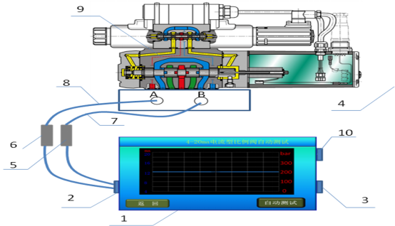1、在線判斷液壓控制閥設備故障;在現代化的生產線包含有液壓控制閥的設備一旦出現故障,普通員工很難判斷是機械故障、液壓故障還是電氣控制故障;該儀器可解決上述問題,一步,斷開與液壓控制閥相連的電氣插頭,把本儀器配套的插頭插上,二步,將壓力傳感器的兩根測壓線連接到液壓控制閥的A、B口測壓點上,三步,打開本儀器電源,選擇與液壓控制閥相對應的信號,手動測試即可判斷是機械故障、液壓故障還是電氣控制故障;如下圖: