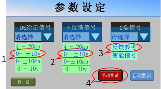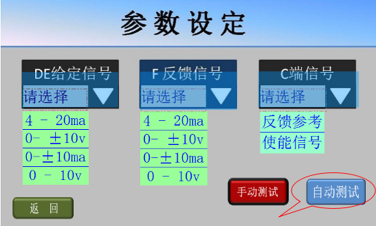 7、手動測試基本正常后,點擊屏幕左下方的返回鍵,返回參數設定畫面;