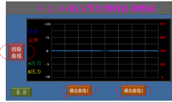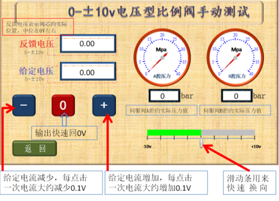 6、比例閥正常時的表現為:a、給定電流OV時,反饋電流在0V,比例閥輸出的A、B腔壓力相同;b、用滑動條可迅速換向,反饋電流改變且A、B腔壓力差較大;c、點擊增加按鈕,反饋電流逐漸增加且A、B腔壓力差逐漸增大;d、點擊減少按鈕,反饋電流逐漸減少且A、B腔壓力差逐漸減少,過0V后比例閥會換向;